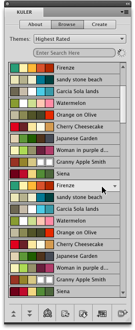 To avoid multiple panels, a button bar was incorporated in a single panel to toggle the Kuler’s features: About, Browse and Create. This reduced development time and unwarranted expenses.